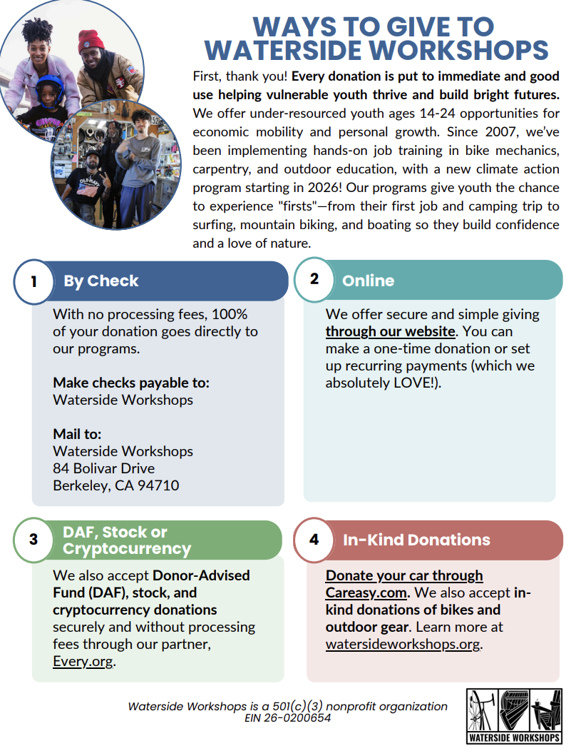 For nearly 20 years, Waterside Workshops has provided hands-on job training, mentorship, outdoor experiences, meals, and a safe space for Bay Area youth to build their futures.